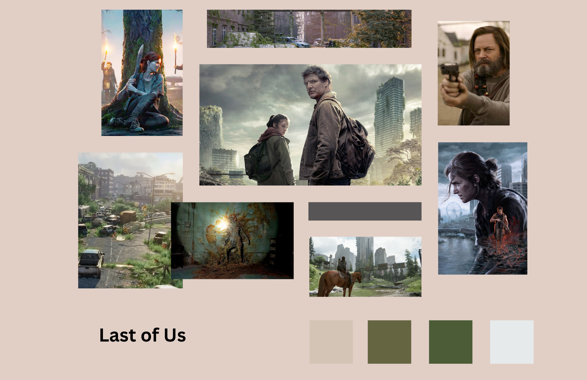 This mood board captures the tone of a post-apocalyptic world through muted colors, layered textures, and emotional imagery. It sets the visual foundation for the title sequence by exploring tension, atmosphere, and narrative depth.